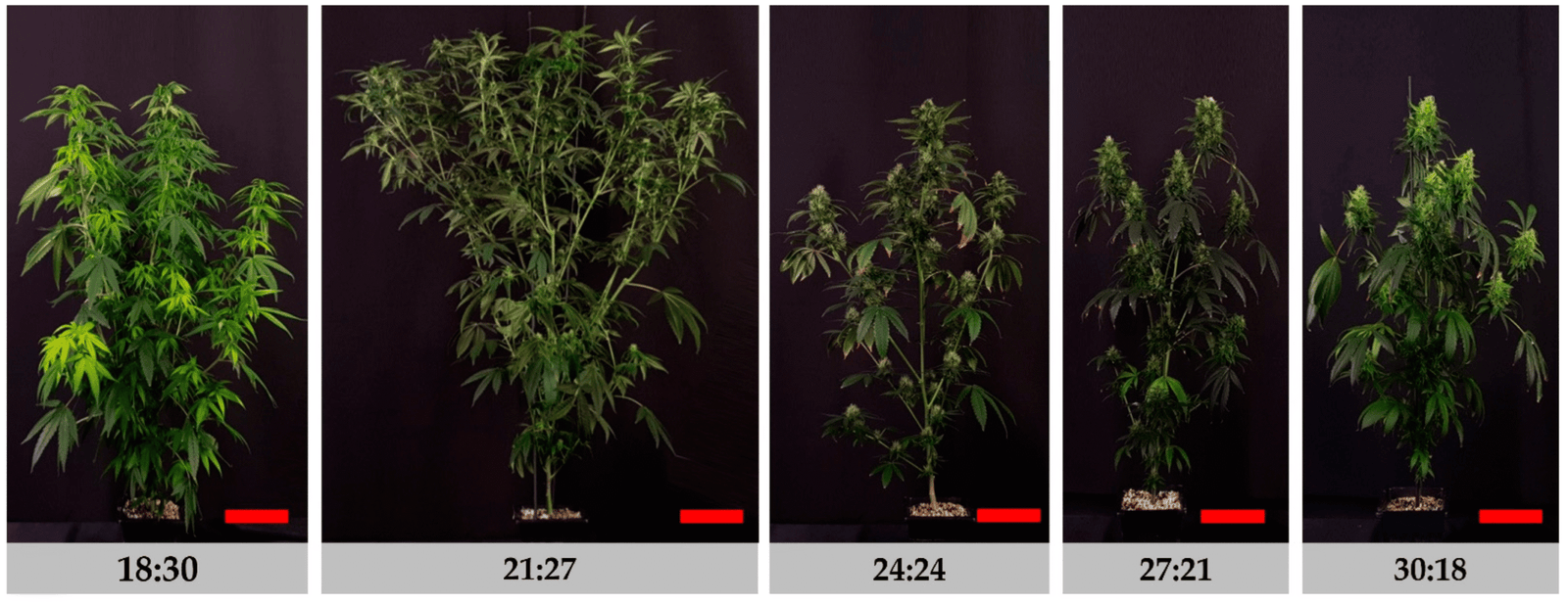 Se observaron diferencias notables en las fotografías de las plantas de cáñamo sometidas a tratamientos DIF. Específicamente, el volumen de la parte aérea presentó el crecimiento más pronunciado bajo el tratamiento 21:27.